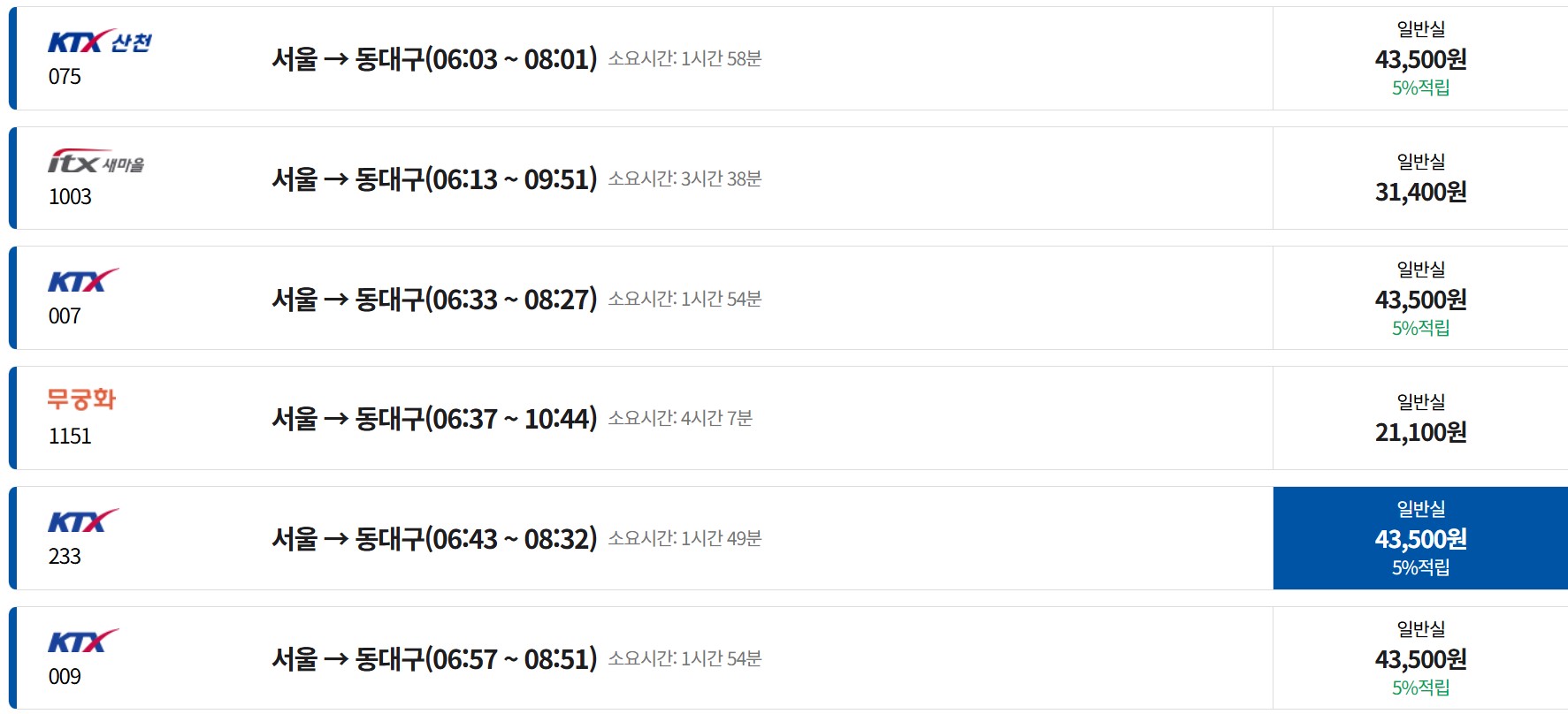 ⑴ 서울역: 출발/06:43/₩43,500원