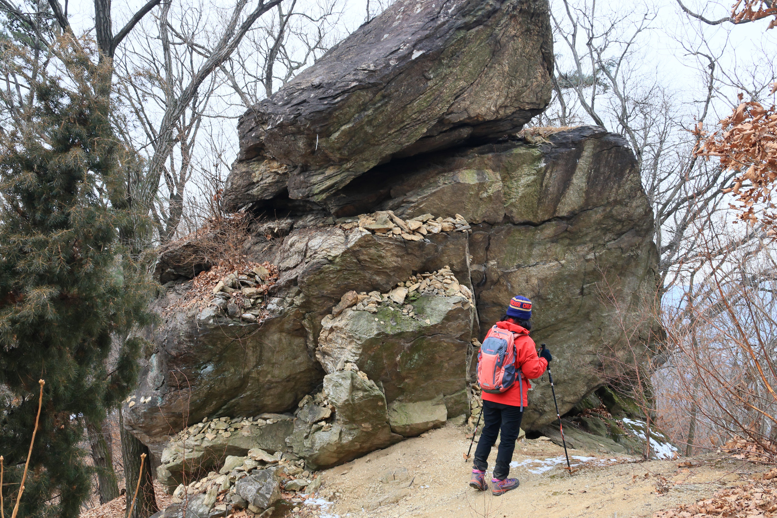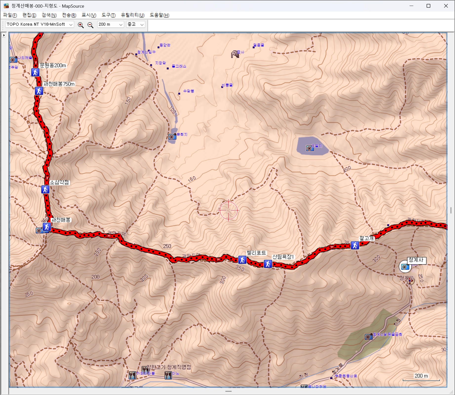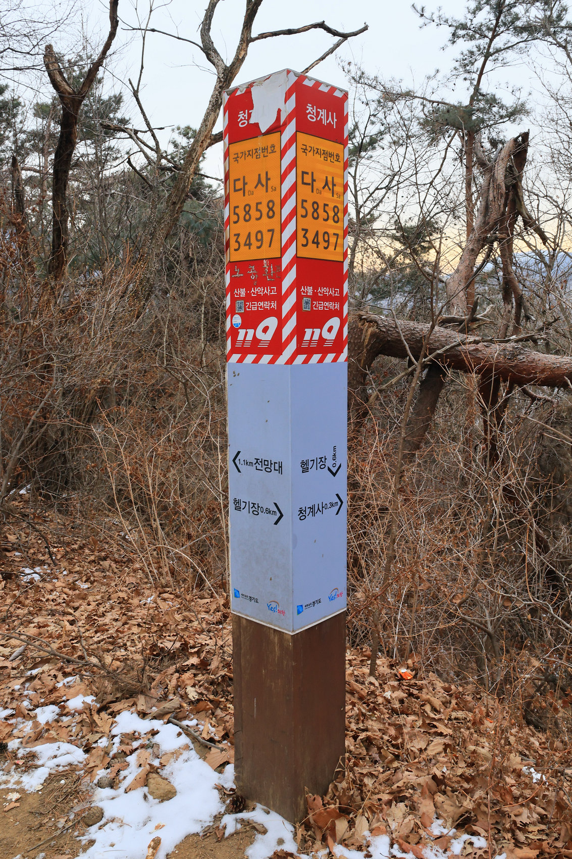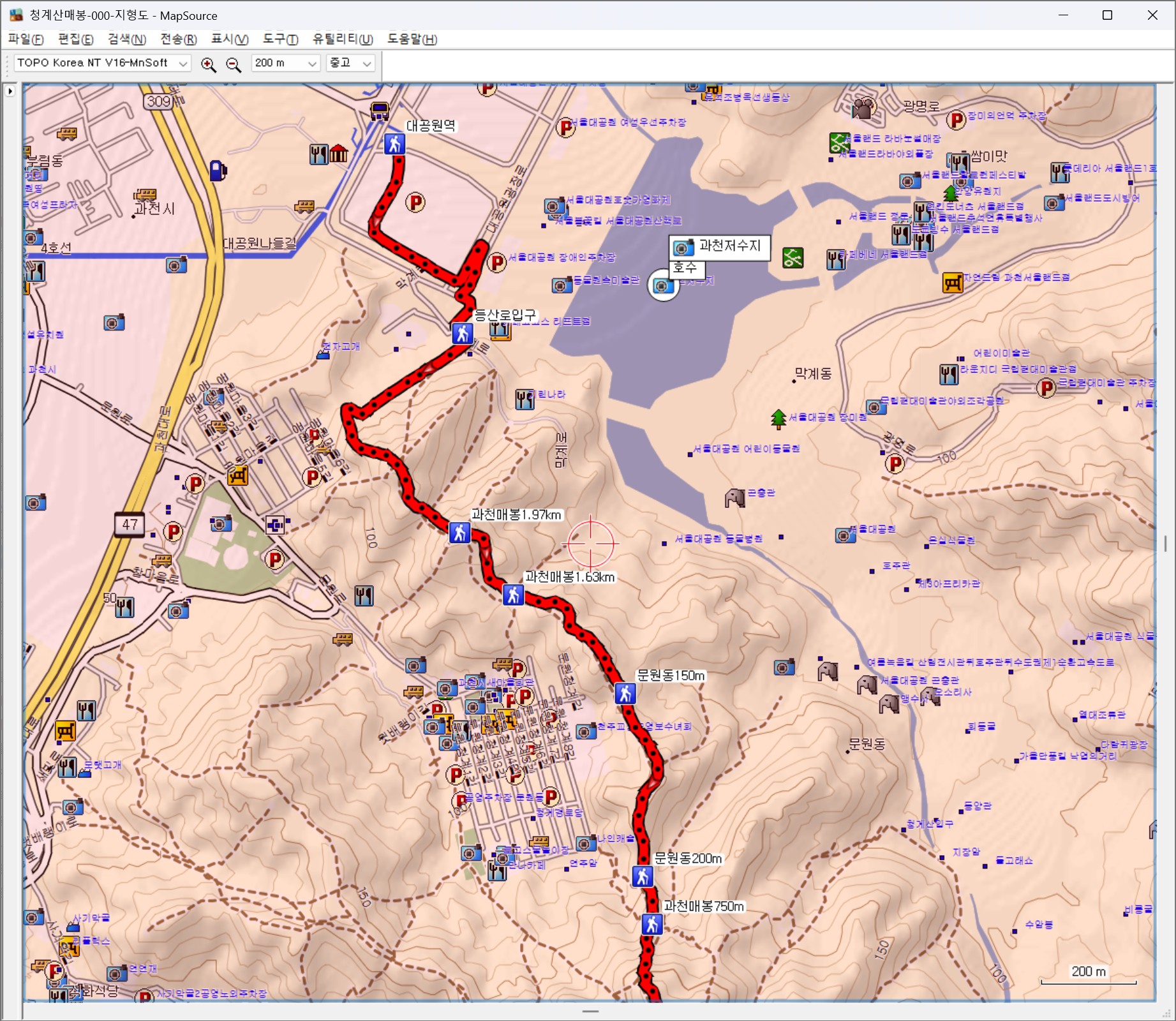 2. 코스: 대공원역/4호선(10:16)~<출발/(10:32)>~등산로입구(10:43)~과천매봉1.97km(10:58)~과천매봉1.63km(11:01)~문원동150m(11:07)~문원동200m(11:13)~과천매봉750m(11:16)~소삼각점(11:34)~과천매봉(11:48)~헬리포트(12:36)~산림욕장1(12:40)~절고개(12:48)~의왕대간16(13:05)~전망대(13:21)~이수봉갈림길(13:32)~석기봉(13:49)~석기헬기장(13:53)~망경대/다사_5946_0000(14:28)~망경대/다사_5948_0000(14:38)~혈읍재(15:05)~청계산매봉(15:29)~매바위(15:38)~돌문바위(15:42)~삼각점/수원404(15:52)~옥녀봉갈림길(15:56)~원터골입구1400m(16:04)~다사_6038_3797(16:38)~원터골입구300m(16:44)~원터골입구(16:53)~소담채/(생두부+순두부)~원터골/정류장/4432번(18:05)~양재역/3호선